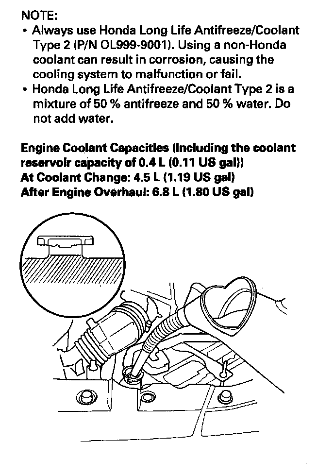 7. Pour Honda Long Life Antifreeze/Coolant Type 2 (P/N OL999-9001) into the radiator up to the base of the filler neck.