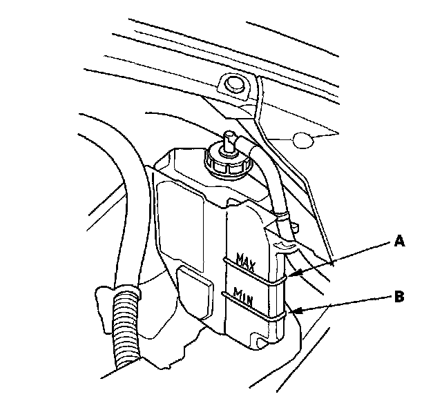 Coolant Check1. Look at the coolant level in the coolant reservoir. Make sure it is between the MAX mark (A) and MIN mark (B).