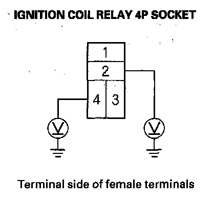 3. Measure the voltage between ignition coil relay 4P socket terminal No. 2 and body ground, then terminal No. 4 and body ground.