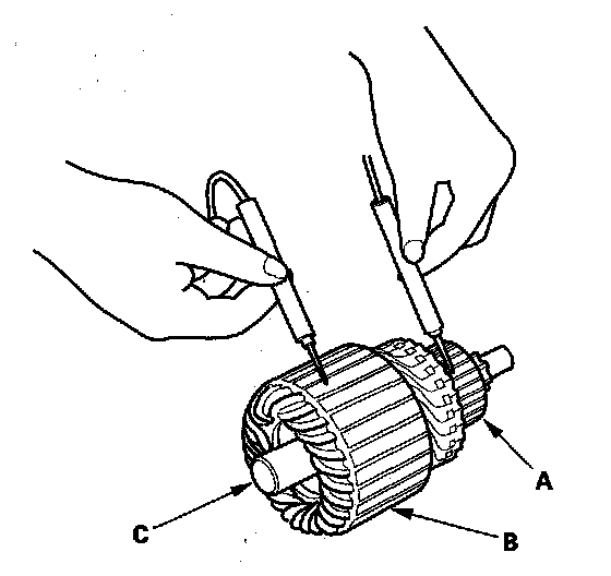 10. Check for continuity between the commutator (A) and the armature coil core (B), and between the commutator and the armature shaft (C). If there is continuity, replace the armature.