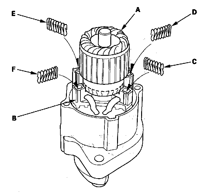 18. While squeezing a spring (C), insert it in the hole on the brush holder, and push it until it bottoms. Repeat this for the other three springs (D, E, and F).