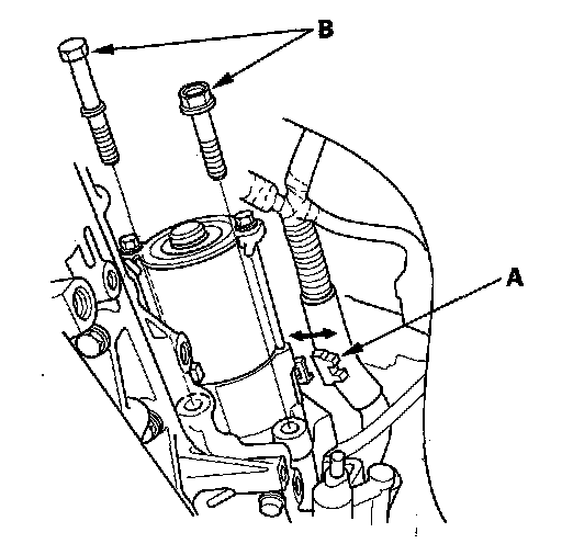 5. Remove the harness clamp (A), and remove the two bolts (B) securing the starter, then remove the starter from the engine.