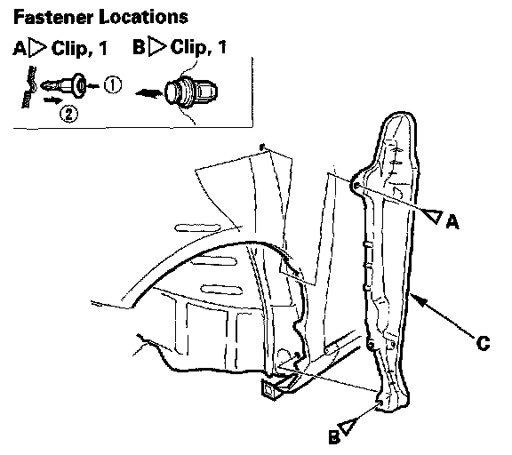 3. From the wheel arch, remove the clip (A), and release the clip (B), then remove the front fender fairing (C).
