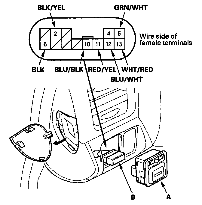 - If the mirror does not tilt down (or does not swing left), check for an open in the GRN/WHT (or BLU/WHT) wire between the left mirror and the 13P connector. If the wire is OK, check the left mirror actuator.