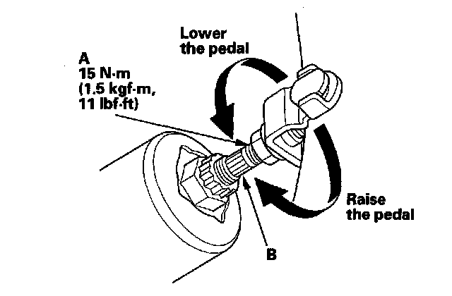 3. Loosen the pushrod locknut (A), and screw the pushrod (B) in or out with pliers until the standard pedal height from the floor is reached. After adjustment, tighten the locknut firmly. Do not adjust the pedal height with the pushrod pressed.