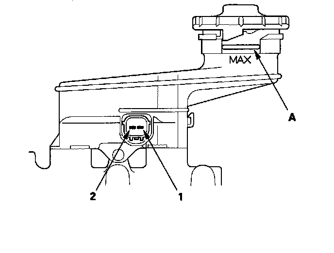 ^ Fill the reservoir with brake fluid to the MAX (upper) level (A). With the float up, there should be no continuity.