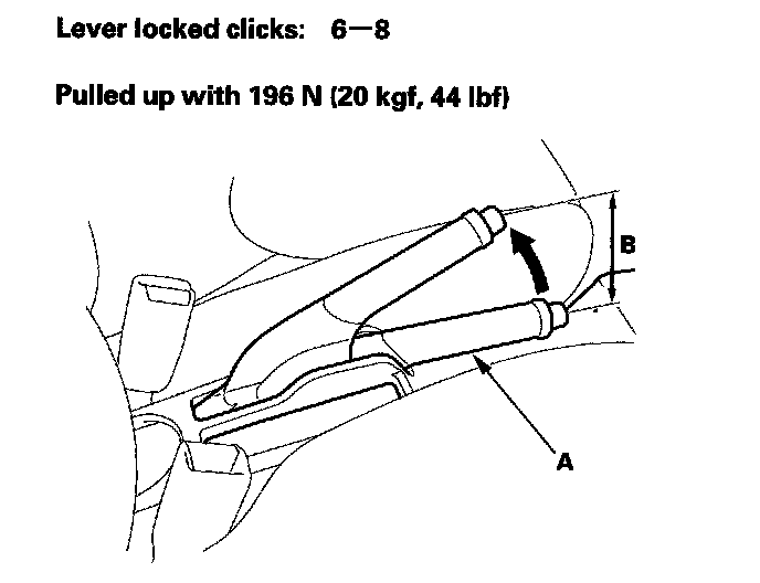 1. Pull the parking brake lever (A) with 196 N (20 kgf, 44 lbf.) of force to fully apply the parking brake. The parking brake lever should be locked within the specified number of clicks (B).