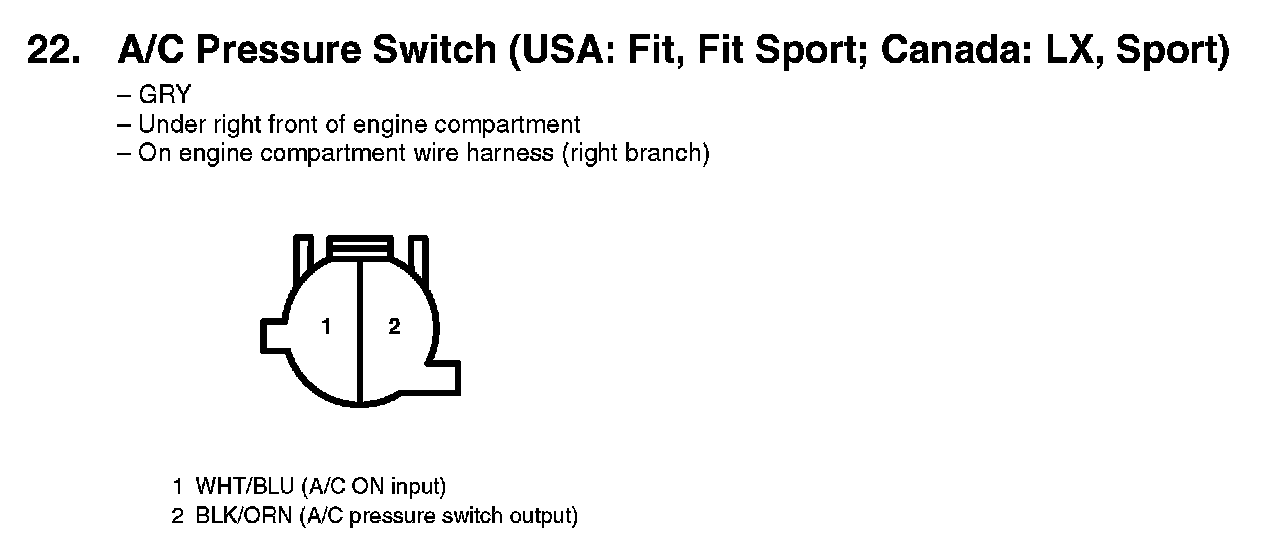 22. A/C Pressure Switch (USA: Fit, Fit Sport; Canada: LX, Sport):