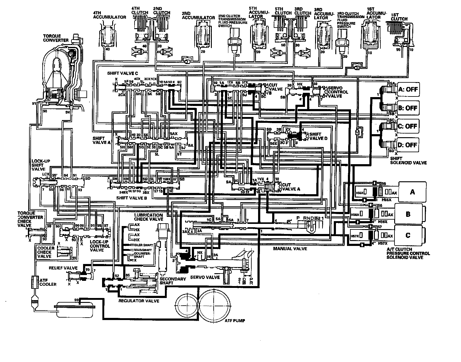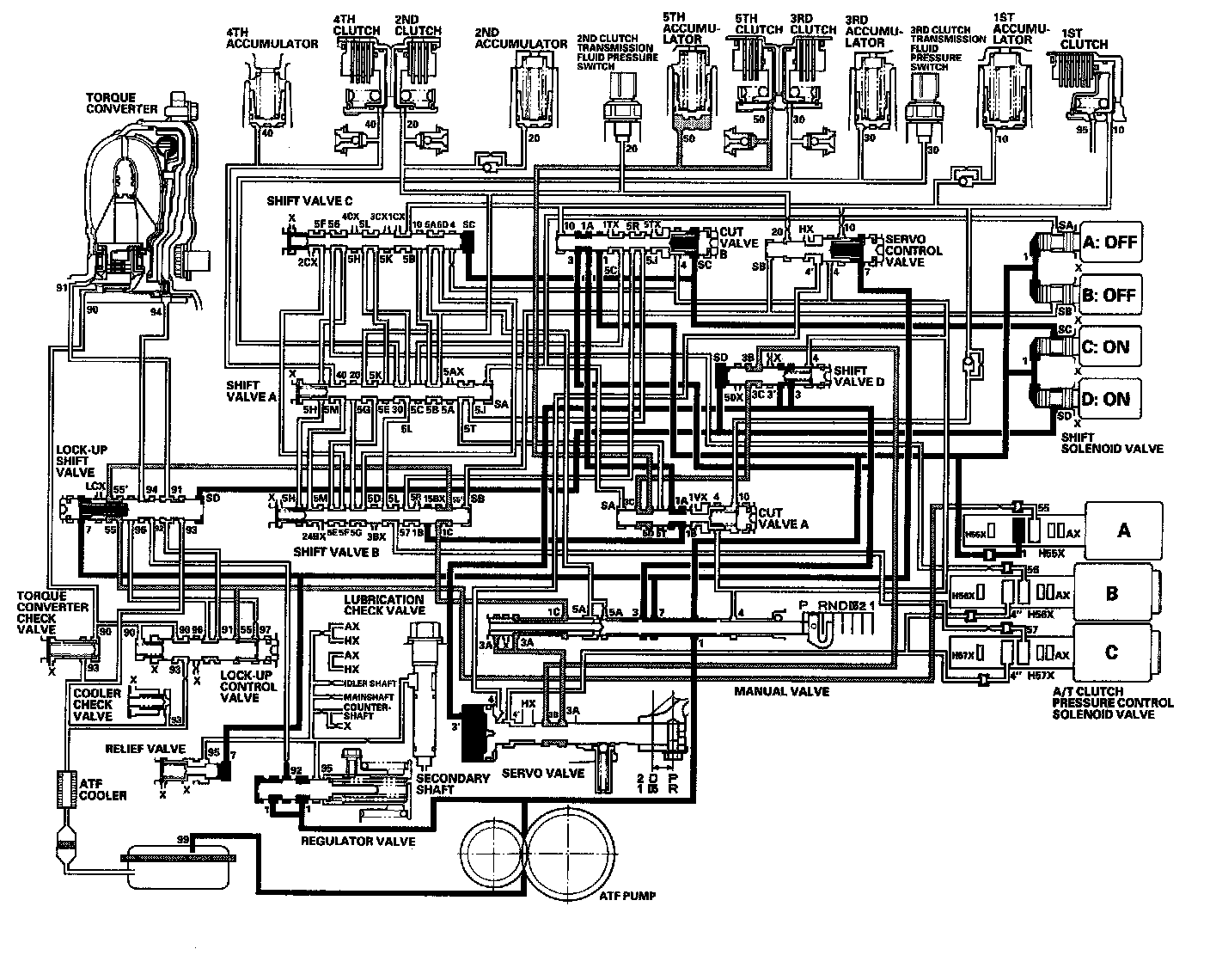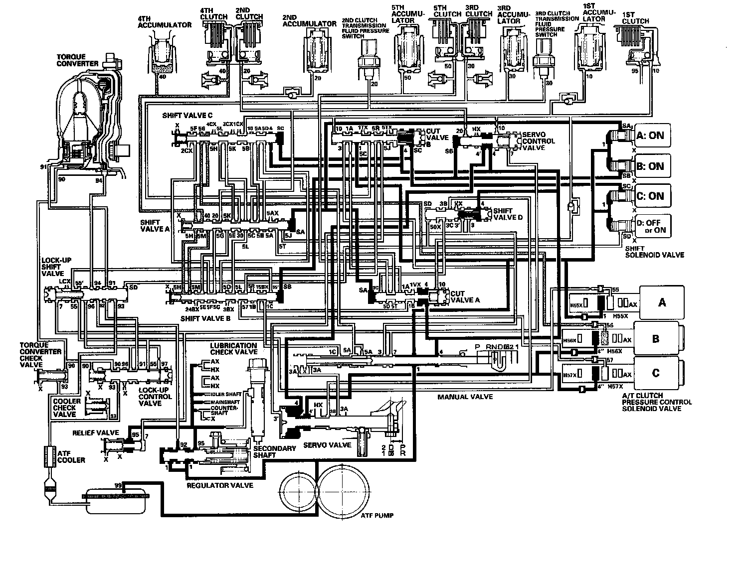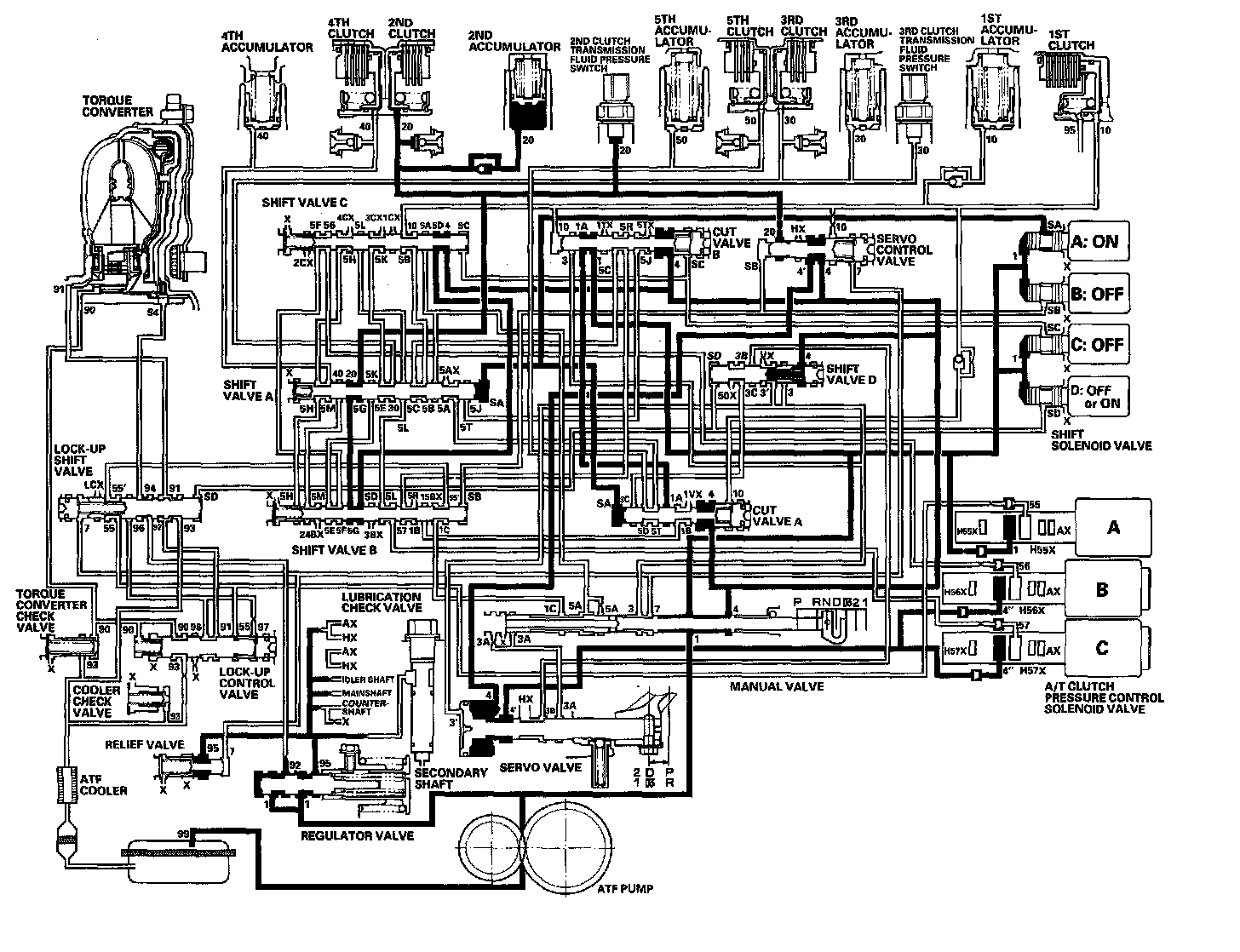 When shifting into R from P or N, line pressure (1) becomes line pressure (1), (3), and (7) at the manual valve. The PCM turns shift solenoid valve D ON, and shift solenoid valves A, B, and C OFF. Shift solenoid valve D pressure (SD) is applied to the left end of shift valve D, and shift valve D is moved to the right side to uncover the line pressure (3) port leading to the servo valve. Line pressure (3') from shift valve D flows to the servo valve, and pushes the servo valve to the reverse position. The PCM controls A/T clutch pressure control solenoid valve A to regulate A/T clutch pressure control solenoid valve A pressure (55), and A/T clutch pressure control solenoid valve A pressure (55) flows to the lock-up shift valve, shift valve B, the manual valve, the servo valve, shift valve D, and cut valve A. A/T clutch pressure control solenoid valve A pressure (3C) becomes 5th clutch pressure (50) at cut valve A. 5th clutch pressure (50) is applied to the 5th clutch, and the 5th clutch is engaged with the A/T clutch pressure control solenoid valve A pressure mode.