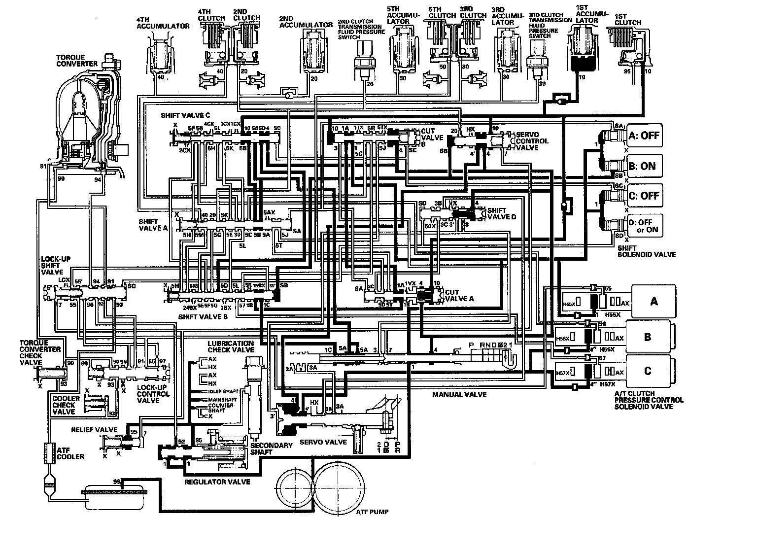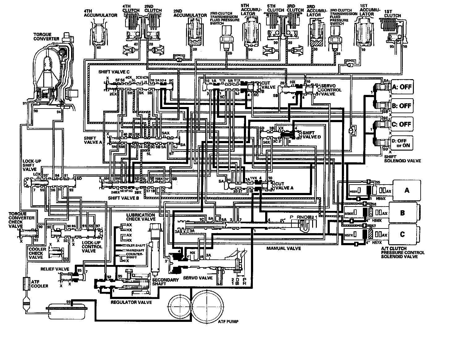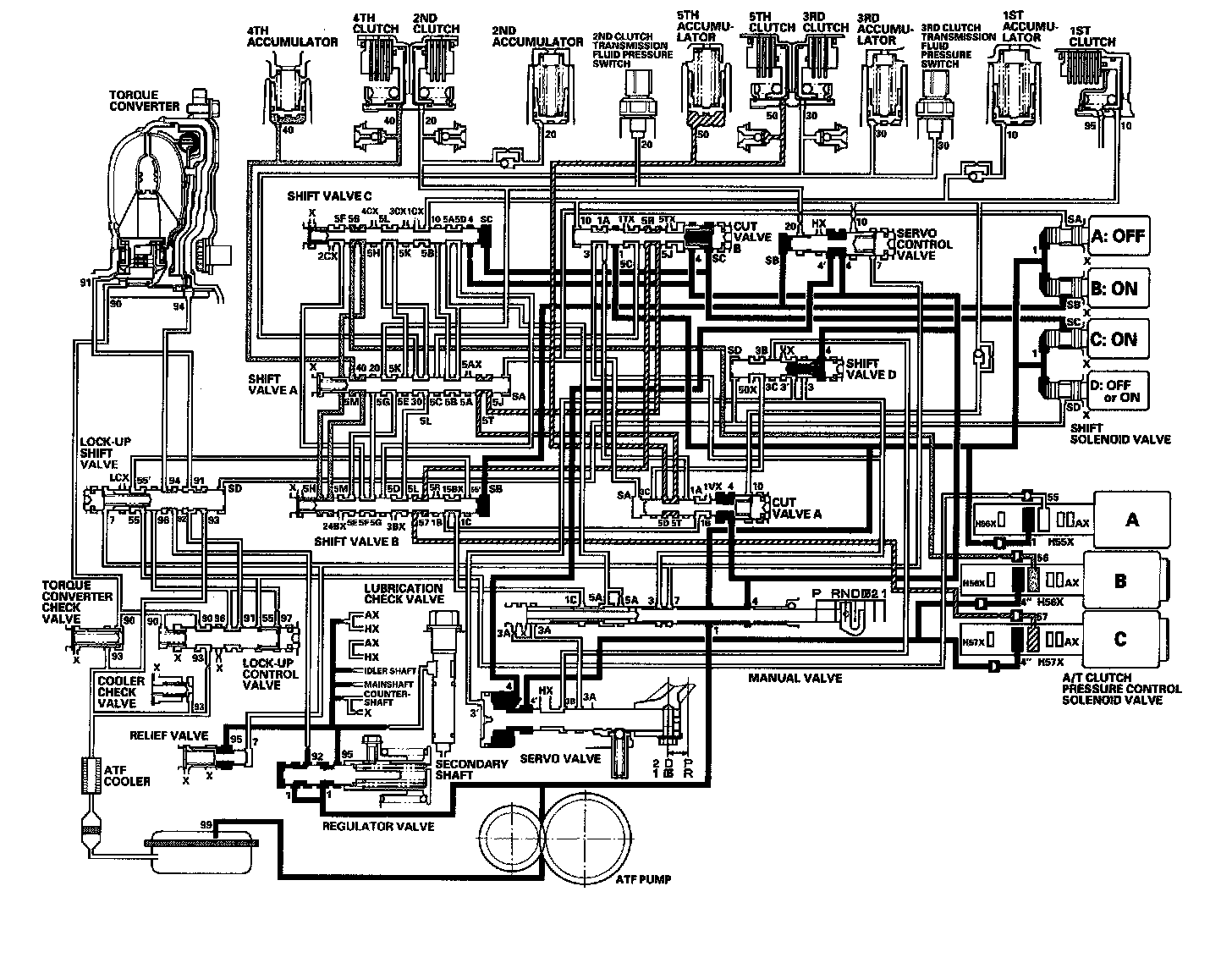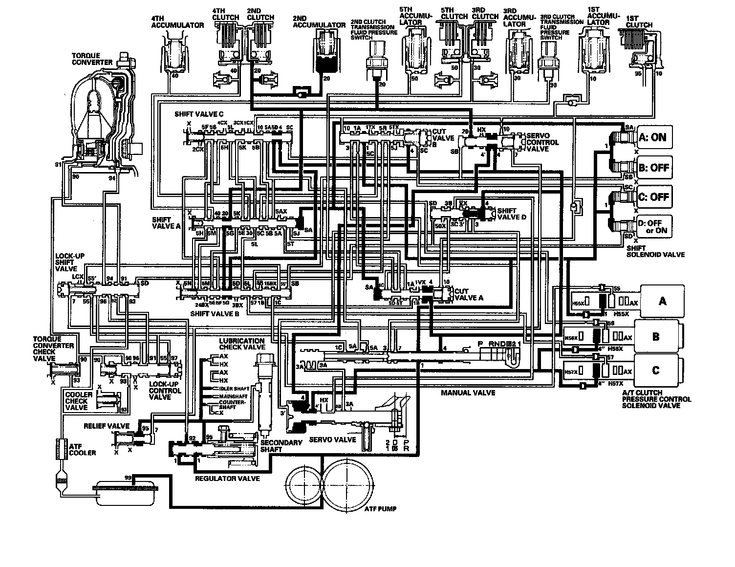 When shifting into R from P or N, line pressure (1) becomes line pressure (1), (3), and (7) at the manual valve. The PCM turns shift solenoid valve D ON, and shift solenoid valves A, B, and C OFF. Shift solenoid valve D pressure (SD) is applied to the left end of shift valve D, and shift valve D is moved to the right side to uncover the line pressure (3) port leading to the servo valve. Line pressure (3') from shift valve D flows to the servo valve, and pushes the servo valve to the reverse position. The PCM controls A/T clutch pressure control solenoid valve A to regulate A/T clutch pressure control solenoid valve A pressure (55), and A/T clutch pressure control solenoid valve A pressure (55) flows to the lock-up shift valve, shift valve B, the manual valve, the servo valve, shift valve D, and cut valve A. A/T clutch pressure control solenoid valve A pressure (3C) becomes 5th clutch pressure (50) at cut valve A. 5th clutch pressure (50) is applied to the 5th clutch, and the 5th clutch is engaged with the A/T clutch pressure control solenoid valve A pressure mode.