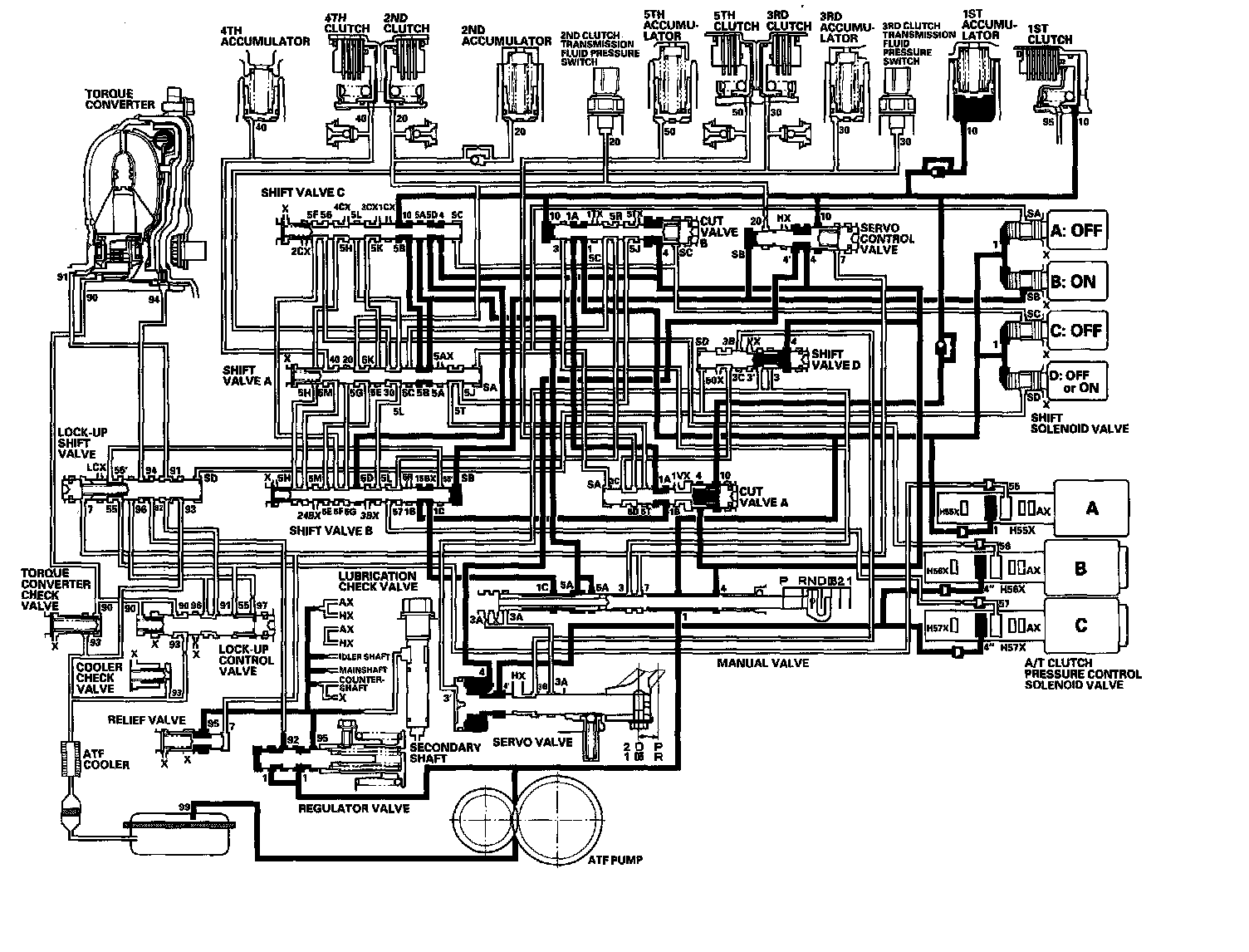 The PCM turns shift solenoid valve C OFF, shift solenoid valve A remains OFF, and shift solenoid valve B remains ON. Shift solenoid valve C is turned OFF, and shift solenoid valve C pressure (SC) in the right end of shift valve C is released. Shift valve C is moved to the right side to release 4th clutch pressure. The 5th clutch keeps engaging with the A/T clutch pressure control solenoid valve C pressure mode.