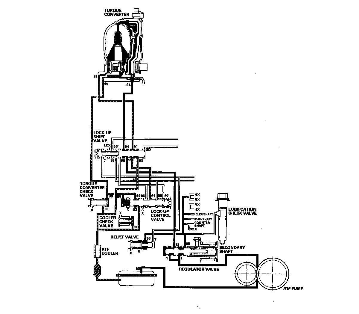 When the vehicle speed further increases, the PCM controls A/T clutch pressure control solenoid valve A to increase A/T clutch pressure control solenoid valve A pressure (55). A/T clutch pressure control solenoid valve A pressure (55) is applied to the lock-up control valve, and the lock-up control valve is moved to the left side to release torque converter back pressure (94). Torque converter pressure (91) enters into the front of the torque converter, and the torque converter clutch piston is securely engaged with the torque converter cover by torque converter pressure. Under this condition, torque converter back pressure is released fully, causing the torque converter clutch to be fully engaged; this condition is full lock-up.