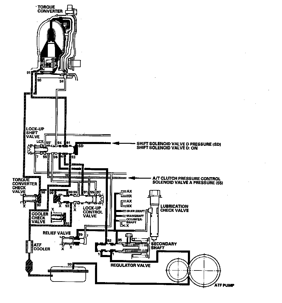 The PCM commands shift solenoid valve D to remain OFF, and shift solenoid valve D covers the port of shift solenoid valve D pressure (SD) to the lock-up shift valve. The lock-up shift valve is in the right side, and uncovers the torque converter pressure port leading to the back of the torque converter. Torque converter pressure (92), regulated by the regulator valve, flows to the lock-up shift valve and becomes torque converter pressure (94). Torque converter pressure (94) enters into the back of the torque converter, and discharges into the circuit from the front of the torque converter. Torque converter pressure enter into back the of the torque converter and is discharged from the front side; this disengages the torque converter clutch piston and the torque converter cover. Under this condition, the torque converter clutch is not engaged; this is the non lock-up condition.
