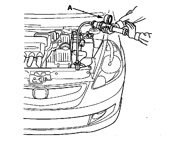 2. Attach commercially available pressure tester (A) to the radiator, and apply a pressure of 93-123 kPa (0.95-1.25 kgf/cm2, 14-18 psi).
