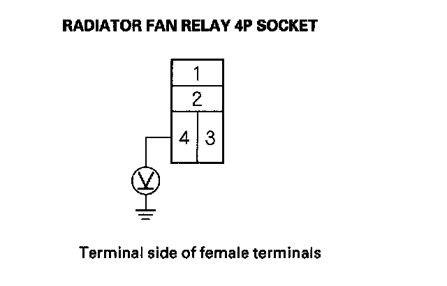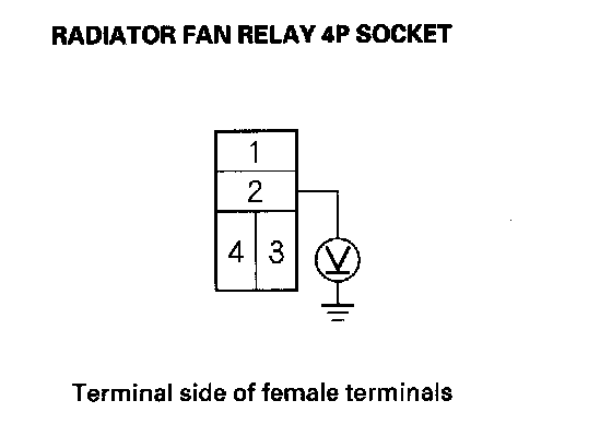 3. Measure the voltage between the radiator fan relay 4P socket terminal No. 2 and body ground.