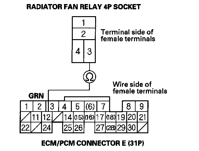 9. Check for continuity between the radiator fan relay 4P socket terminal No. 3 and the ECM/PCM connector terminal E12.