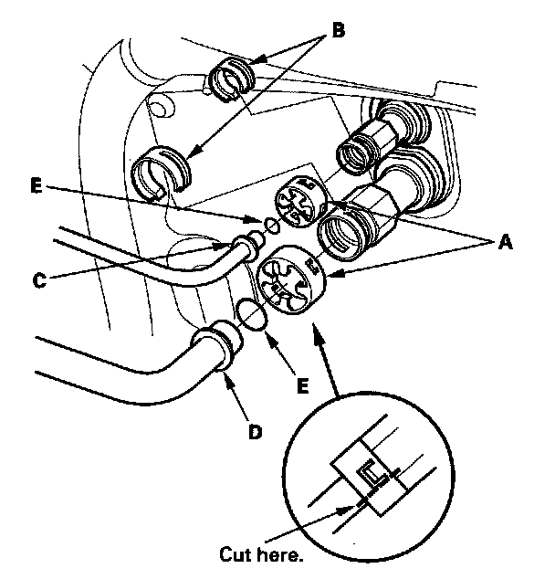 2. Cut the joint caps (A) and thoroughly clean around the joints of dirt and debris by pressurized air or detergent. Remove the stops (B), then disconnect the receiver line (C) and the suction line (D), and remove the O-rings (E). Clean inside wall of the joints of dirt and debris using a refrigerant oil (SP-10) applied swab. Do not use compressed air or detergent after disconnecting the joints. Plug or cap the lines immediately after disconnecting them to avoid moisture and dust contamination.