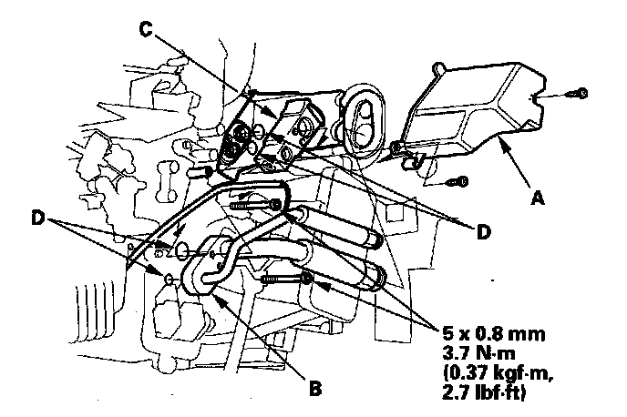 4. Remove the self-tapping screws and the pipe cover (A), then remove the bolts, the inlet and outlet pipes (B), the expansion valve (C), and the O-rings (D).