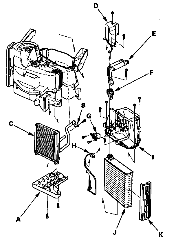 10. Remove the self-tapping screws and the pipe cover (D). Remove the bolts, the inlet and outlet pipes (E), and the expansion valve (F). If necessary, remove the self-tapping screws and the blower resistor (G). Remove the evaporator temperature sensor connector (H), then remove the self-tapping screws and the duct (I). Pull out the evaporator core (J) with the plate (K).