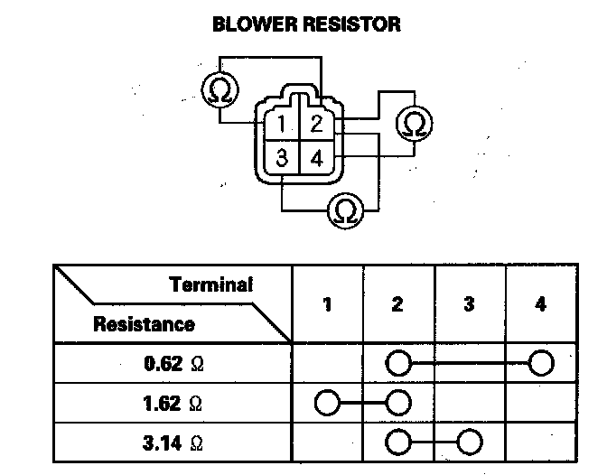 2. Measure the resistance between the following terminals of the blower resistor and compare them with the values in the table.