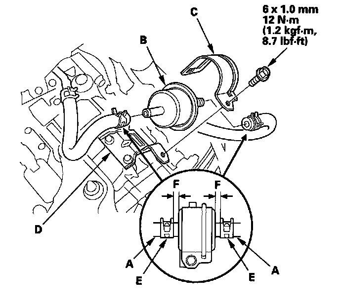 10. Slide the ATF cooler hose on the ATF filter until the hose end contacts the filter housing, and secure the hose with the clip (E) at 6-8 mm (0.24-0.31 in.) (F) from the filter housing. Install the cooler hose on the other side of the ATF filter in the same manner.