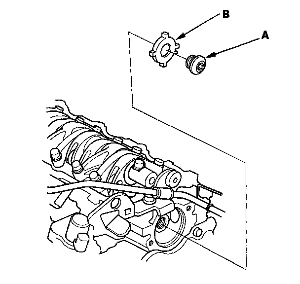 7. Remove the CMP pulse plate mounting bolt (A) and CMP pulse plate (B) from the camshaft.