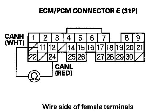 15. Measure resistance between ECM/PCM connector terminals E11 and E24.