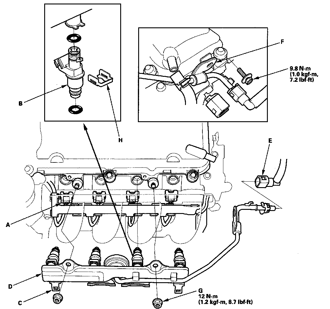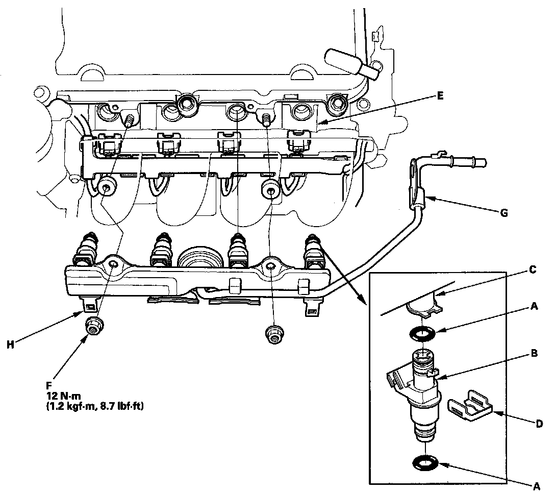 13. Install the fuel rail mounting nuts (F). Install the fuel rail bracket (G).