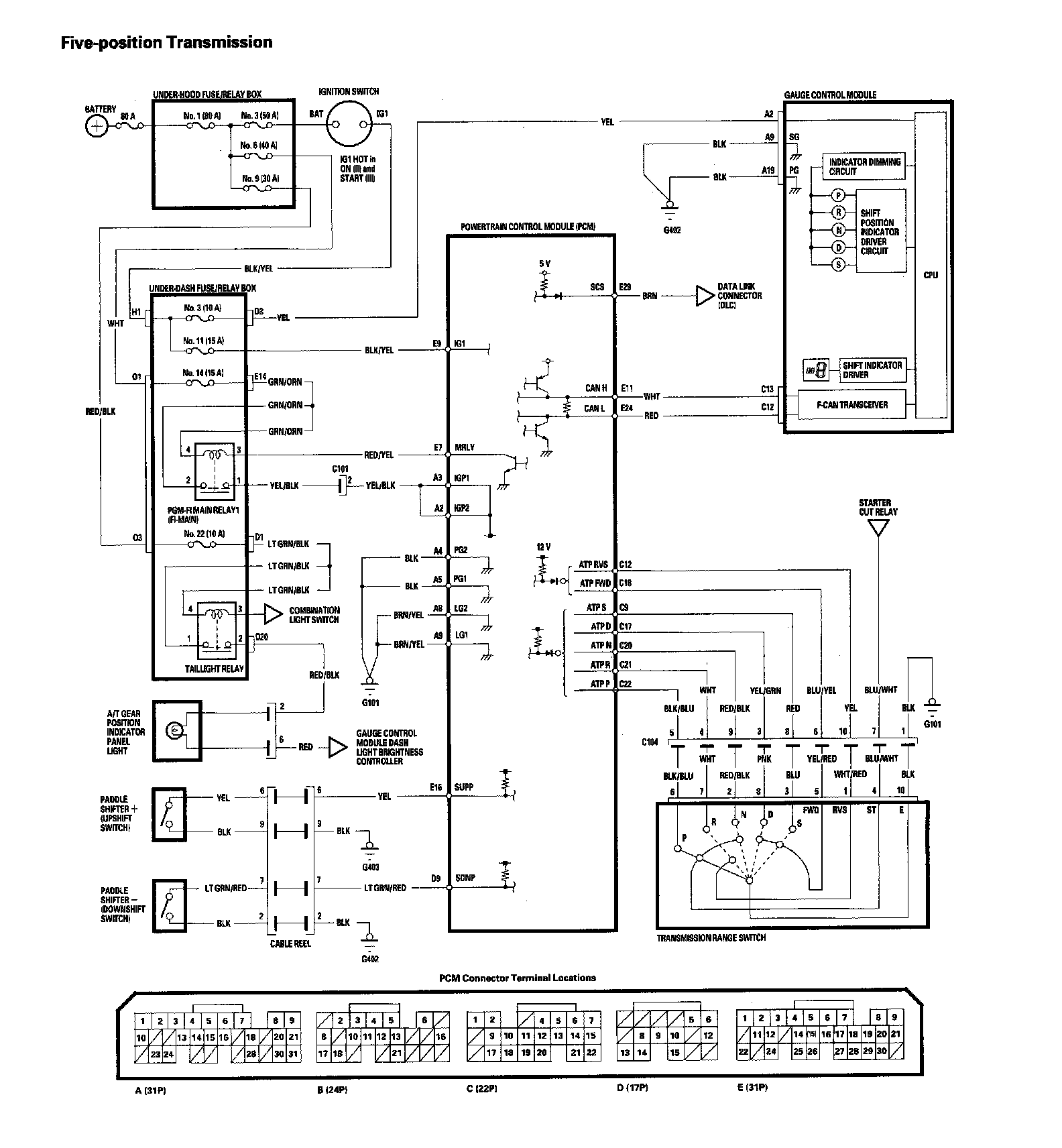 A/T Gear Position Indicator Circuit Diagram - Five-position Transmission: