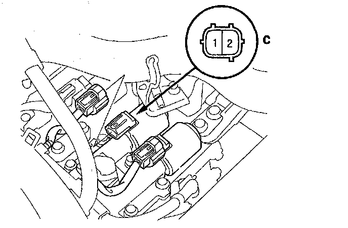 7. Connect a jumper wire from the negative battery terminal to solenoid valve C connector terminal No. 2, and connect another jumper wire from the positive battery terminal to connector terminal No. 1.