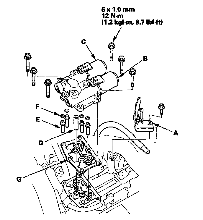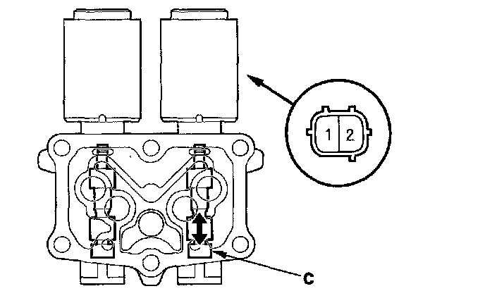 12. Disconnect one of the jumper wires, and check valve movement at the fluid passage in the valve body mounting surface. If the valve binds or moves sluggishly, or if the solenoid valve does not operate, replace A/T clutch pressure control solenoid valves B and C.