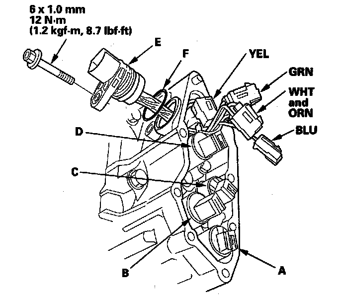 10. Install the new O-ring (F) on the new shift solenoid harness connector, and install the connector in the transmission housing.