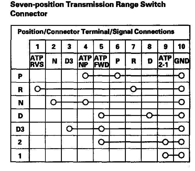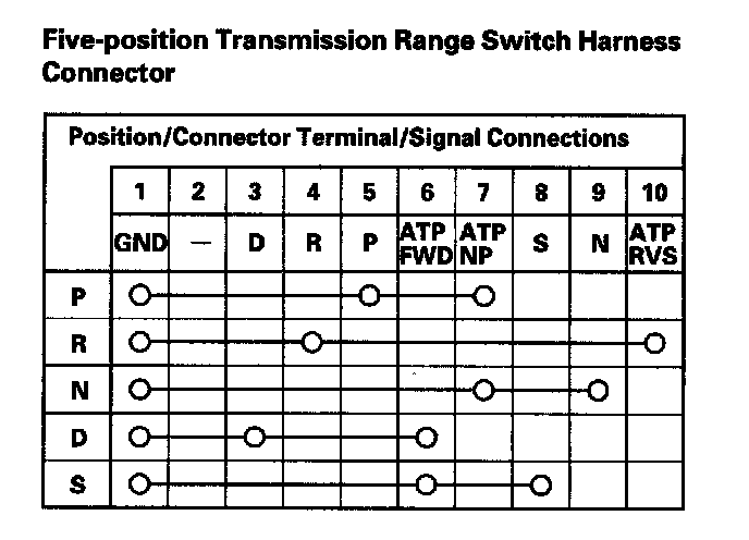4. The transmission range switch test is finished if the test results are OK. If there is no continuity between any terminals, go to step 5.