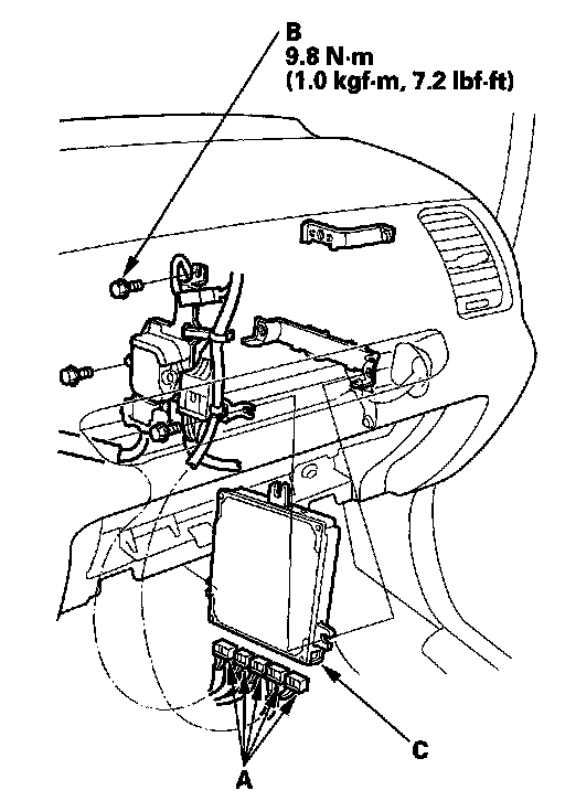 8. Disconnect the connectors (A), and remove the bolts (B), then remove the ECM/PCM (C).