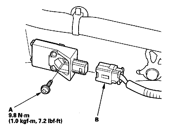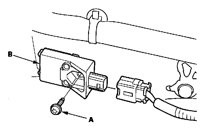 1. Install the new side impact sensor (second) with the TORX bolt (A), then connect floor wire harness 2P connector (B) to the side impact sensor (second).