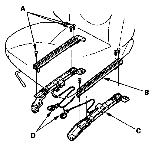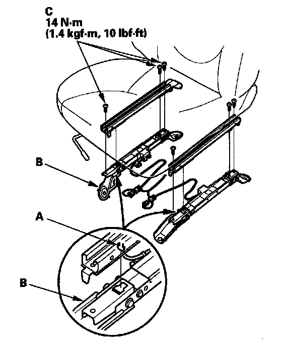 - Make sure both of the hooks (A) on the seat track are properly secured to the front bracket (B). If the hooks are not properly secured, the weight sensors will not function properly.