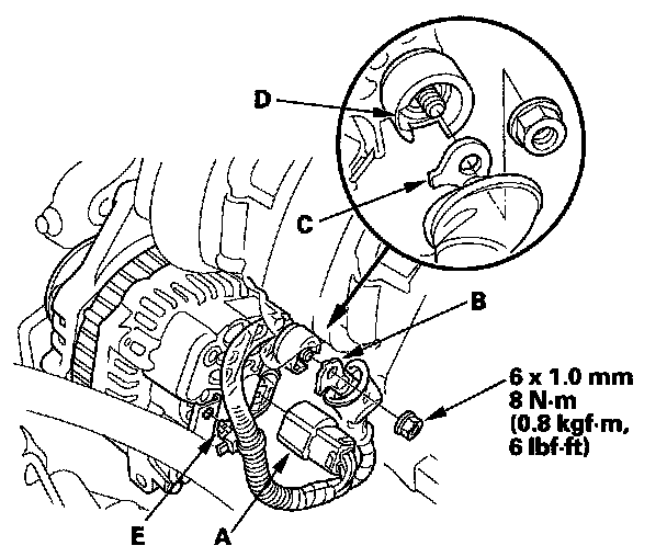 4. Connect the alternator connector (A) and the BLK wire (B) by aligning the tab on the terminal (C) and the groove (D) of the terminal insulator, then install the harness clamp (E).