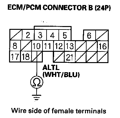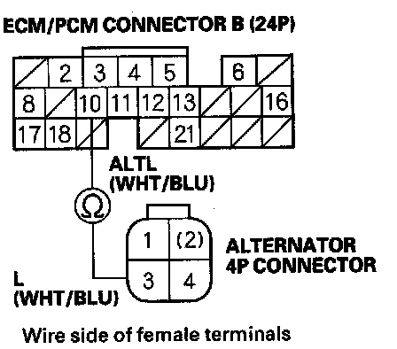 24. Check for continuity between ECM/PCM connector terminal B10 and the alternator 4P connector terminal No. 3.