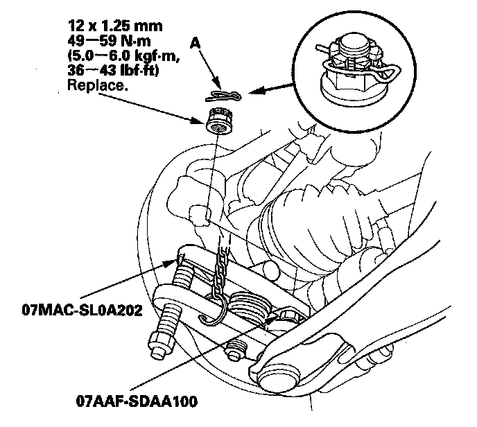 4. Remove the lock pin (A) from the lower arm ball joint, then remove the nut.