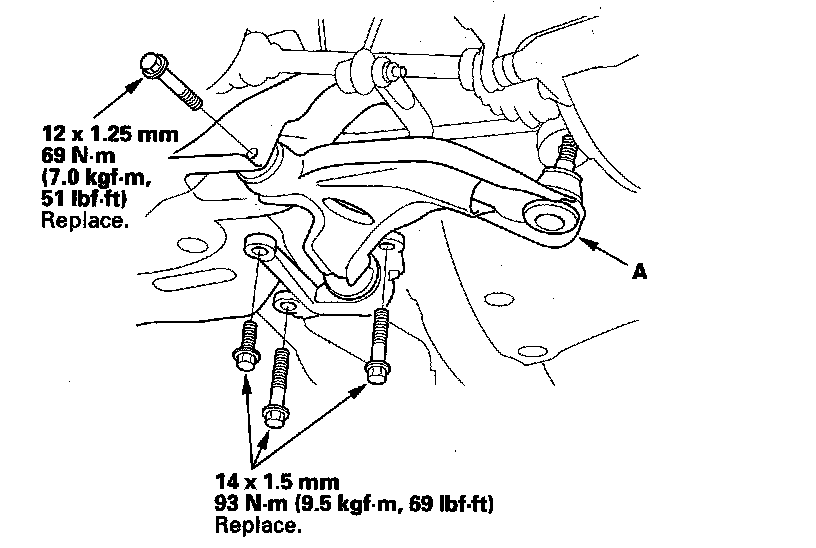 6. Remove the lower arm mounting bolts, then remove the lower arm (A) from the front subframe.