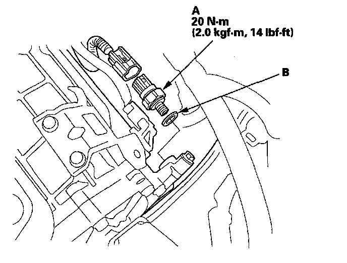 8. Install the new 2nd clutch transmission fluid pressure switch with a new sealing washer (B), and tighten the metal part of the switch.