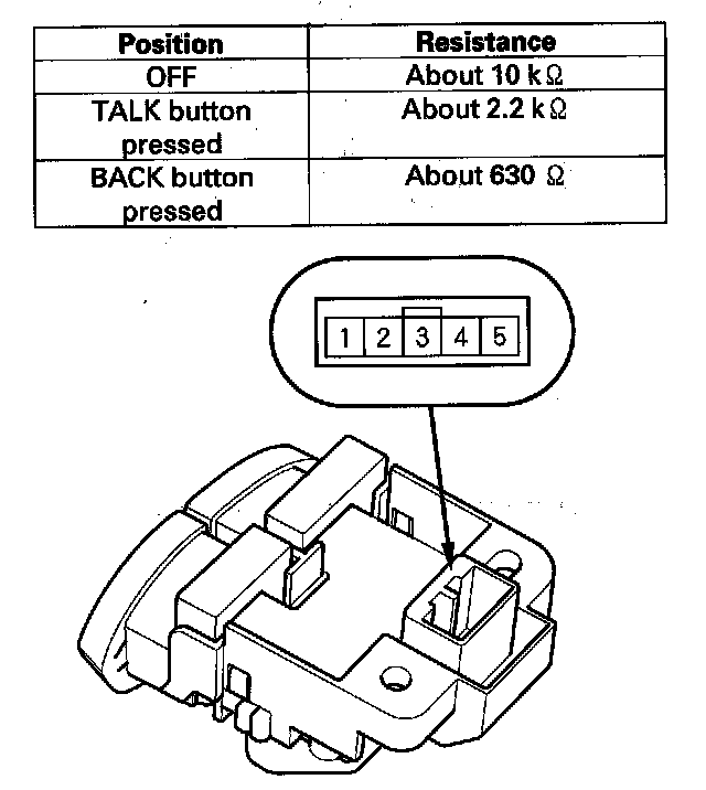 2. Measure the resistance between the No. 1 and No. 2 terminals in each switch position according to the table.