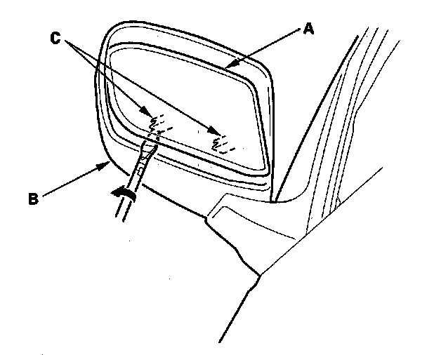 2. Put a shop towel in the opening between the lower edge of the mirror holder and the mirror housing (B) to prevent scratches, and detach the bottom clips (C) with a flat-tip screwdriver wrapped with protective tape.