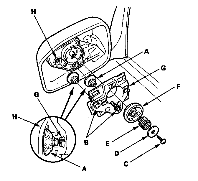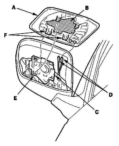3. Carefully pull out the bottom edge of the mirror holder (A) to separate the adhesive (B), and then release the side clips (C). If equipped, disconnect the mirror defogger connector (D).