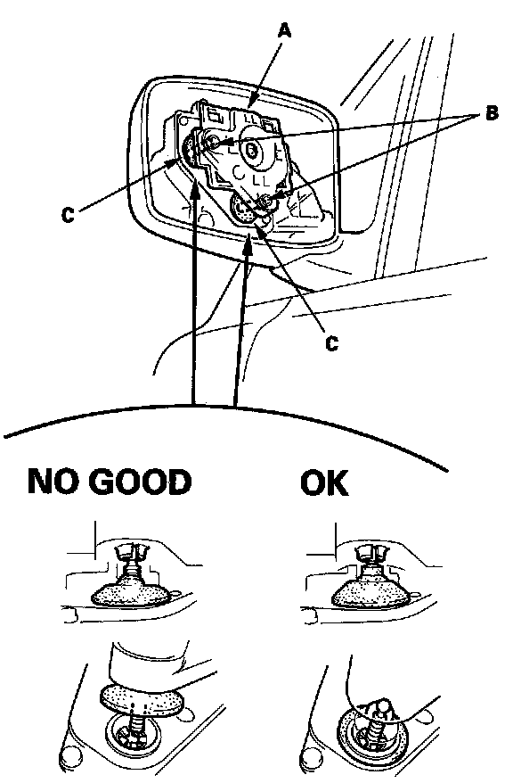 5. Before reinstalling the mirror holder to the inner holder (A) of the actuator, check the actuator rods (B) and the actuator boots (C):