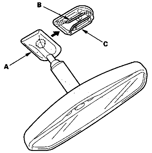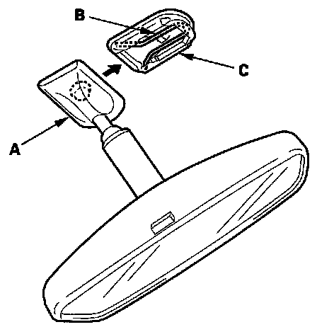 4. Slide the rearview mirror (A) down toward the bottom of the windshield to detach it from the spring (B) in the mount (C).