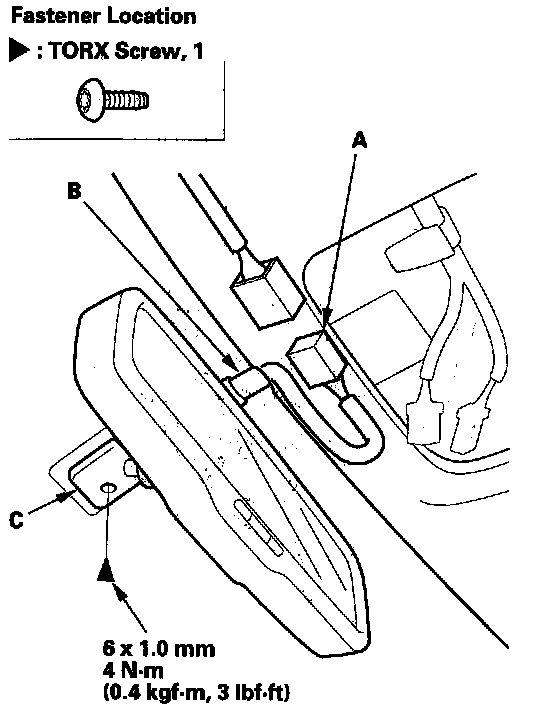2. Disconnect the connector (A), and slide the mirror harness upper cover (B) forward, then remove the screw from the mirror base (C),