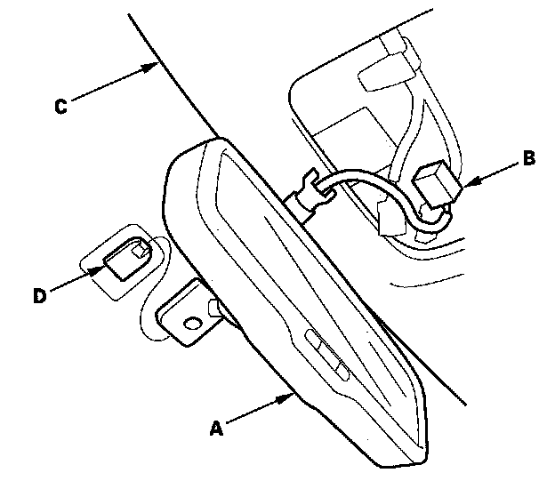 3. While holding the rearview mirror (A), the mirror harness connector (B) out through the headliner (C), then remove the rearview mirror from the mount (D).