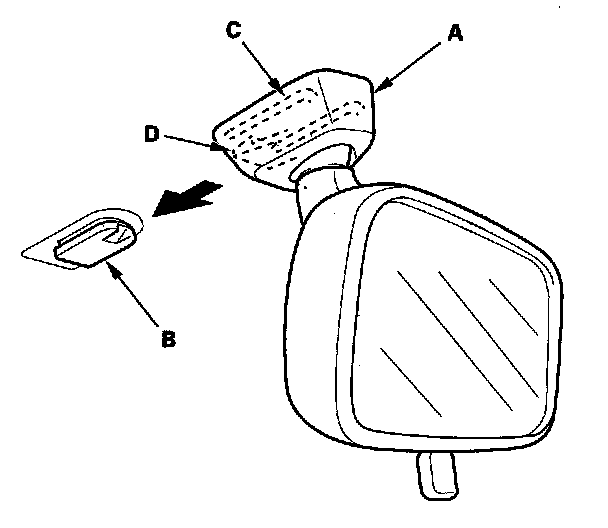 2. Pull the hook (A) down to release it from the mount (B), and the slide the mirror base (C) rearward, then remove the rearview mirror (D).