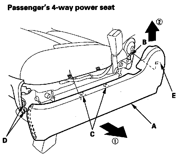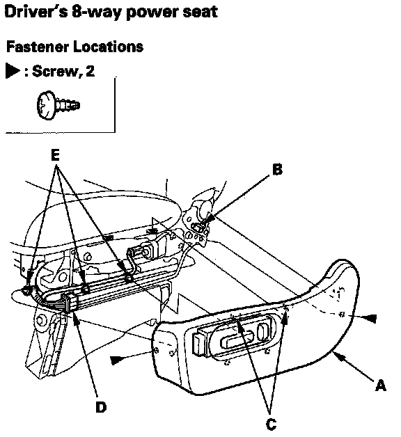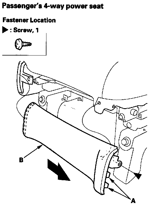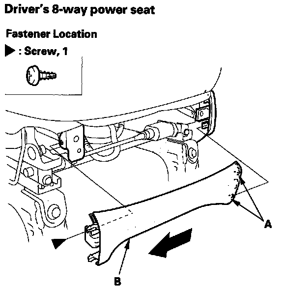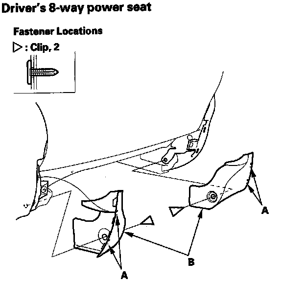 10. Driver's 8-way power seat: Remove the recline lower cover (A) and center lower cover (B).